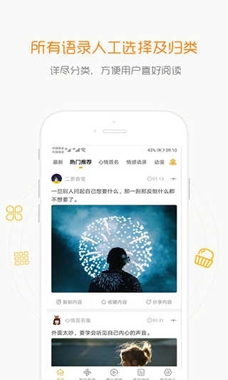每一条心情说说都在诉说一段心情物语,每一条心情日记都是自己的情感语录,收集大量的早安语录、晚安心语作为每天的开始和结束,励志语录传递正能量。