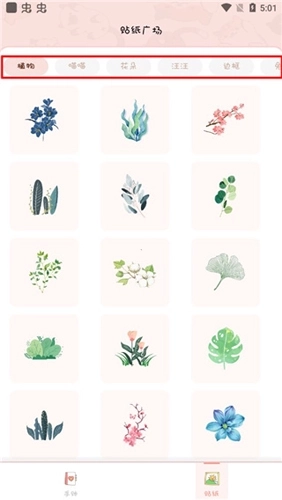 5、这里是贴纸广场,平台把贴纸都做了详细分类,大家快来挑选喜欢的贴纸来做手账吧。