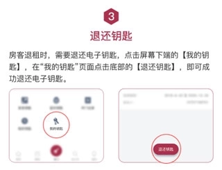 房客退租时,需要退还电子钥匙,点击屏幕下端的【我的钥匙】,在"我的钥匙"页面点击底部的【退还钥匙】,即可成功退还电子钥匙