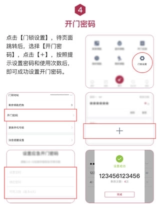 点击【门锁设置】,待页面跳转后,选择【开门密码】,点击【+】,按照提示设置密码和使用次数后,即可成功设置开门密码