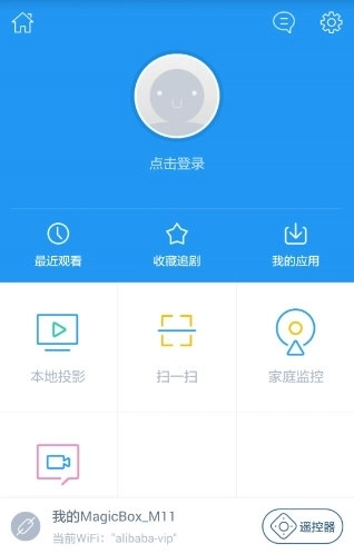 上图是电视机连上手机安装阿里TV助手,打开之后的页面。可以看到此款拥有本地投影、遥控器、家庭监控和扫一扫的功能。