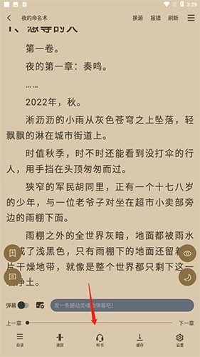 2、进入阅读页面,点击空白处,然后点击“听书”选项即可。