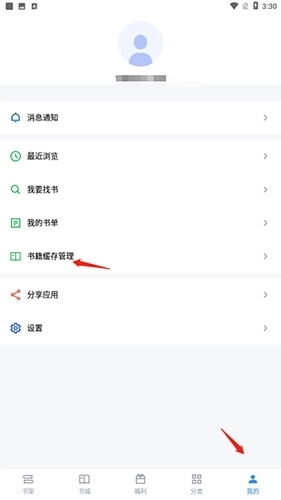 1、打开软件,点击底端的“我的”选项,然后点击“书籍缓存管理”选项。
