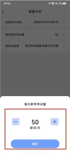 ③点击“每日新学单词量”即可通过“+”“-”调整每日新学单词量,点击“确定”完成更改。