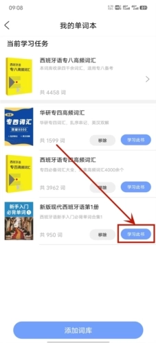 ④在“我的单词本”界面继续点击“学习此书”,点击“确定”,即完成了切换学习词库。