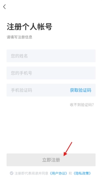 5、选定身份后,依次填写姓名、手机号,获取并输入验证码,确认无误后点击“立即注册”完成账号创建。