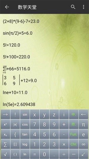 数学天堂完美实现了加‘+’、减‘-’、数列、行列式、矩阵、极限、积分等一系列数学符号的书写格式以及定义的计算功能。