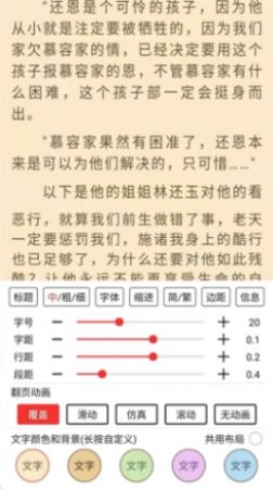 2、模式定义,自由转换,包括阅读的背景颜色,和文字颜色,字体以及翻页效果,找到最适合自己的阅读模式;