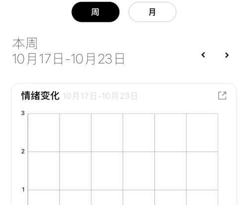 如果想查看减压心情日记软件里记录的心情状态连成的图标,只需点击底部的【心情统计】,然后在这里选择【周】或【月】,就能看到这段时间心情的连续转变,操作起来很方便。