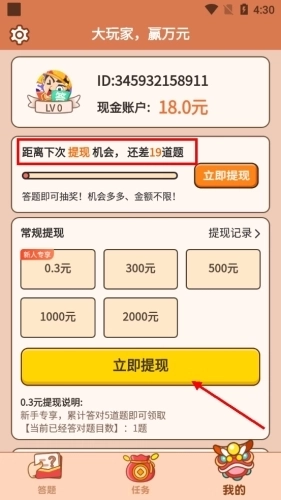 2、提现的前提是新手用户需要答对五题、老用户则需要达到上方的答题次数后才可以提现。