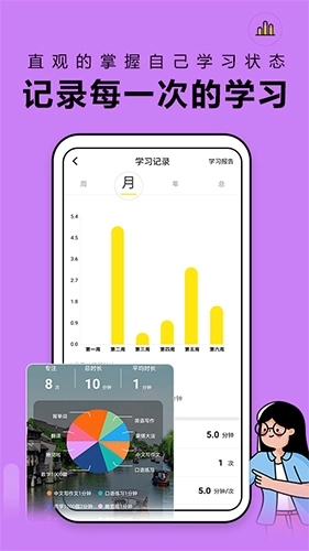 【学习报告】:包含柱状图、饼状图、线性图的学习统计,早晚打卡情况统计;VIP用户可查看专属学习报告,以及study相关学习报告内容。