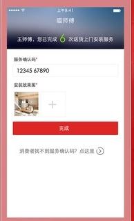 2.服务确认码核销流程:录入消费者提供的10位服务确认码、拍摄现场服务完成的照片、点击完成按钮;