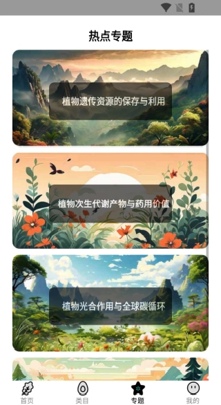 植物图文鉴是一款专为植物爱好者打造的应用,收录了上万种植物信息,涵盖常见花草到稀有多肉植物等各类品种。用户可以收藏自己见过的植物,方便后续查看。此外,应用还设有热点专题板块,包含植物遗传资源保护与利用、植物次生代谢产物与药物价值等多方面的植物相关知识。