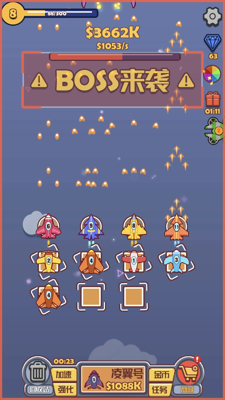 2、在应对不同的Boss时,得先把战机等级提升上去,这样才能更有优势。