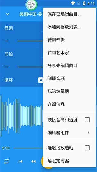 1、借助滑块来调节音频的播放速度与音调,并能实时查看调整后的效果。