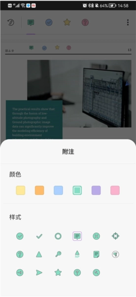 2、在可用选项范围内挑选便签类型,长按选中的便签选项,就能选择其颜色和样式。