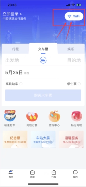 1、打开国铁吉讯,点击右上角的“wifi”标志。
