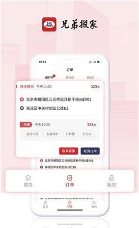 1、打开兄弟搬家,主页面底部设有首页、订单和我的这几个选项,点击进入订单页面;