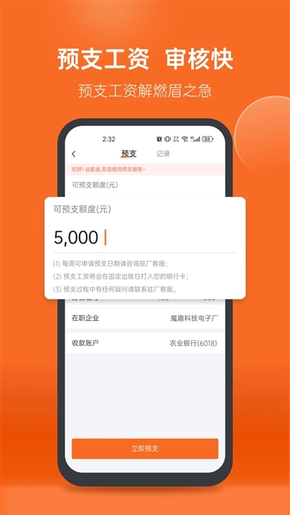 求职者需与平台合作企业签订劳动合同,入职满7天且正常出勤,提交预支申请并上传工作证明,审核通过即可到账。