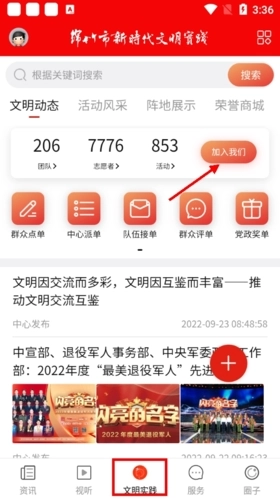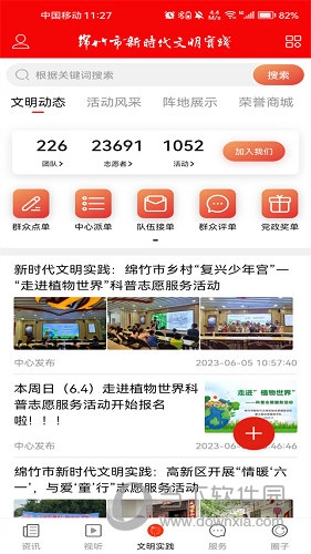 1、打开画境绵竹,进入“文明实践”页面后点击“加入我们”,这里展示的便是当前时段开放的所有志愿者服务团体。