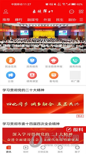 画境绵竹是一款为四川省绵竹地区用户量身打造的综合新闻媒体服务软件,核心功能是提供绵竹本地要闻与政务资讯,同时覆盖网络视听、新闻资讯、便民服务、政务服务、文明实践、互动交流等多方面,是一款能带来全方位城市生活体验的应用产品。该软件聚焦时政新闻与民生资讯,第一时间发布市委、市政府及全市各镇、街道、部门的权威信息,密切关注绵竹人身边的民生和社会类新闻,致力于为群众排忧解难,提供多领域专业且便捷的服务。和之前的版本相比,软件对首页版块进行了优化升级,新增加了就业信息、政务服务、生活缴费、服务热线、天府健康通、教育云平台、看电视、听广播这八大功能。在画境绵竹里,用户还能查询到广播电台信息和近期天气状况,它不仅为本地居民服务,对外来游客也设有十分便捷的导航功能,能让用户更快速地找到所需版块,喜欢这款软件的朋友们赶紧来体验吧。