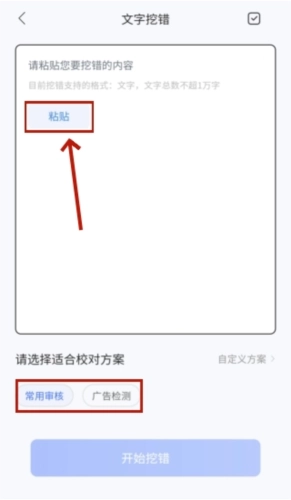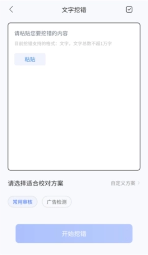 1、点击【文本挖错】功能按钮,输入或粘贴预先准备好的文本内容,点击“粘贴”按钮后,选择您所需的校对方案,再点击“开始挖错”按钮即可。