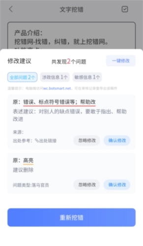 3、点击修改建议右上角的“一键修改”按钮,系统会自动修正文本里的错误信息、敏感信息等问题,之后复制处理好的文本,就能导出并放心使用了。