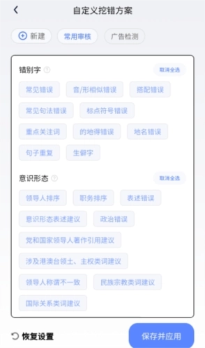 挖错方案的自定义内容可精准设置并支持单独勾选,能依据文本的使用场景来配置个性化的自定义方案,而且该方案还能保存以便下次快捷调用。