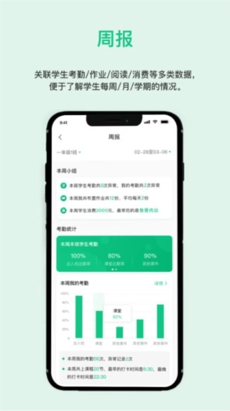 在周报界面里,能够查看学生每周的学习状态和考勤信息。