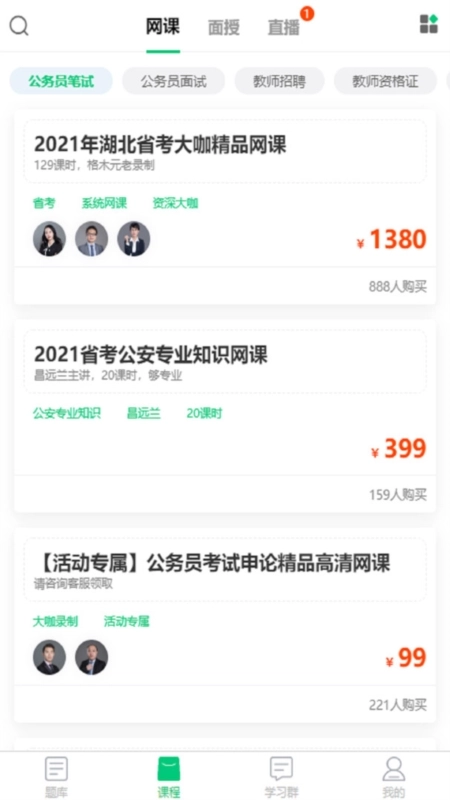 1、覆盖多种考试类型:目标考试范围涵盖公务员国考、地方公务员考试、事业单位考试等,针对不同考试类型,配备相应的专属题库、直播课程、高清网络课程及面授课程。