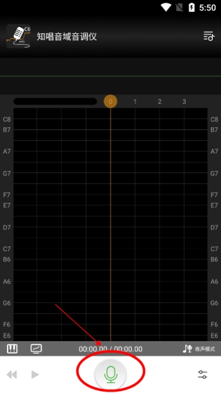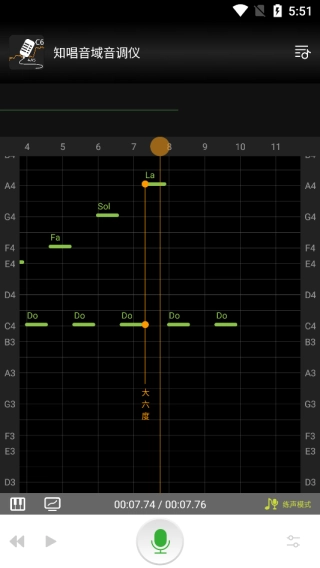 进入主界面后,点击录音按钮,接着对着手机唱歌,您就能看到音调曲线随着时间的推移在屏幕上实时显示出来了。