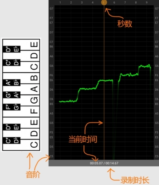 通过实时获取麦克风的音频输入,把人声的音高频率和音名建立对应关系,再以音调曲线的形式即时呈现在屏幕上。