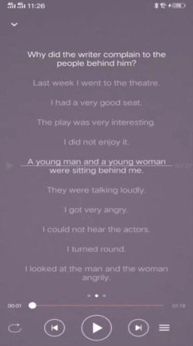 1、英语听力功能可实现听力播放与课文内容同步显示,同时涵盖课文、翻译及单词板块。