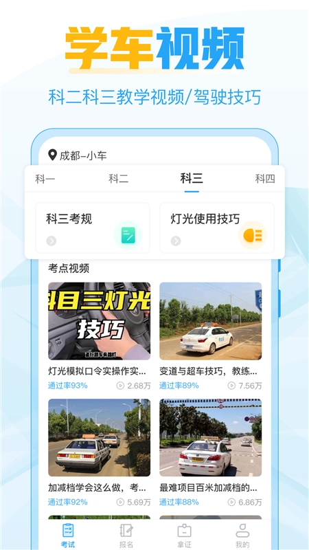 2、教学视频:科目二与科目三教练实拍专业讲解视频,全程剖析考试项目。助力你培养车感,熟悉档位、离合、后视镜,一看就懂,一点就通过;