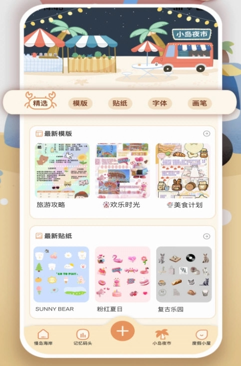 小岛夜市已全新开放,新增了推荐内容与主题贴纸包,素材摊位也变得更值得一逛啦