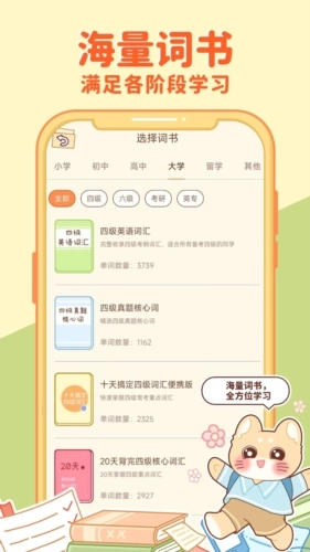 3、海量词库:喵喵单词拥有丰富多样的词库资源,涵盖了四六级、考研考博等各类词汇内容