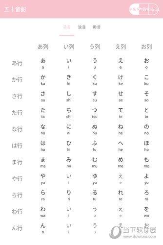 1、在樱花日语的五十音图界面,用户可以开展五十音图的学习活动。界面上方设有功能选项,支持平假名、片假名、清音、浊音、拗音之间的切换操作。