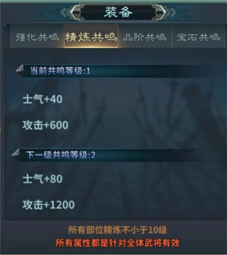 2、精炼:装备可通过金油进行精炼,精炼石可从一夫当关、商店购买、充值礼包、寻宝充值商店等渠道获取。当全部装备的精炼等级每提升5级,就能获得一个共鸣等级,精炼共鸣的属性为增加士气与攻击,且该属性会随共鸣等级的提升而增强。