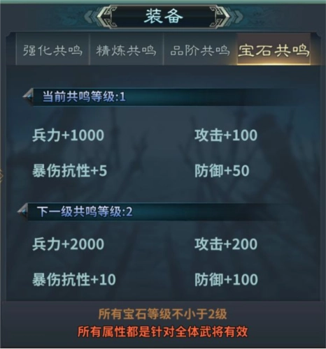 4、品阶共鸣:当穿戴一整套不同颜色的装备时,能够激活共鸣等级属性,该属性主要增加兵力以及攻击伤害加成;其中白色装备对应1级共鸣,其他颜色依次按等级递增。