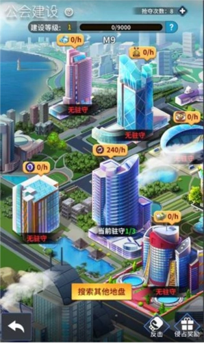 每个地盘产出的资源各不相同,玩家可安排自己的主角驻守在地盘内。地盘中驻守的主角数量越多,资源产出量就越高。不过,一旦完成驻守便无法取消,需等待倒计时结束后自动卸下;若被其他玩家成功抢夺,也会立即卸下。此外,驻守获得的资源会每日重新累计,到当天24点时,将平均分配给参与驻守的所有公会成员。