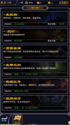 玩家点击右下角的“玩法”按钮,就能体验竞技场、挖矿、贪婪金猪等六项玩法。