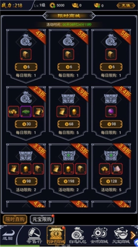 玩家点击右下角的商城按钮,就能进入商城选购物品;寄售行支持商品的买卖操作;商城内还设有限时商品专区可供购买;此外,金币、元宝、时装商城以及自选礼包这四个页面也都能进行物品选购。