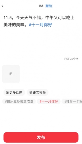3、我们以动态为例,输入你想要发布的动态内容,还可以附带图片和话题,之后点击发布按钮,就能在社区动态里完成发布了。