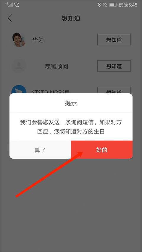 3、可看到通讯录好友名单,选择需要获取生日信息的好友,点击“想知道”选项,