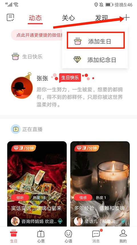 1、打开生日管家app,选择右上角“+号”图标,然后选择“添加生日”选项,