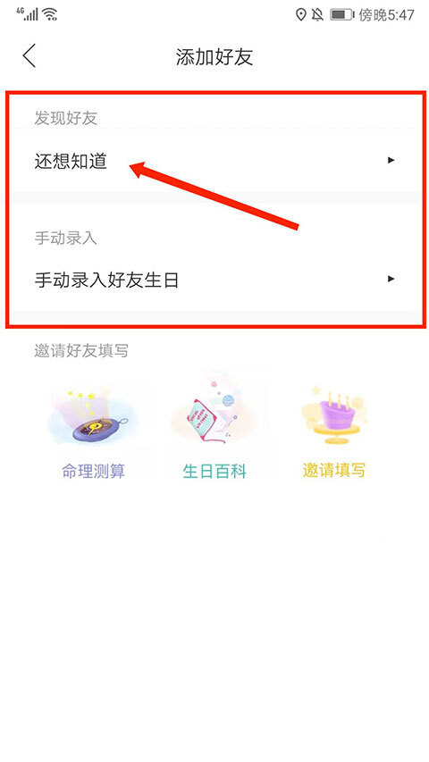 2、分为“发现好友”好友生日信息选项和“手动录入”好友生日信息选项,这里以“发现好友”为例,