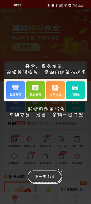 1、在本站下载安装打开软件之后,在首页找到开票、查看发票、编辑关联抬头、查询月账单中找到新增月账单服务,车辆交易、发票、金额全都一目了然。