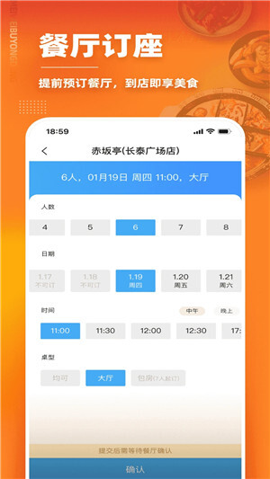 3、进入预约页面,选择人数、日期、时间、桌型等信息,点击确认提交,然后等待餐厅确认,确认完毕即可预订成功。