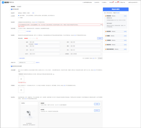 用户商家后台在上传产品时需要选择商品类目并创建,然后输入商品标题、关键词、属性、添加商品图片、详情页等基本信息。