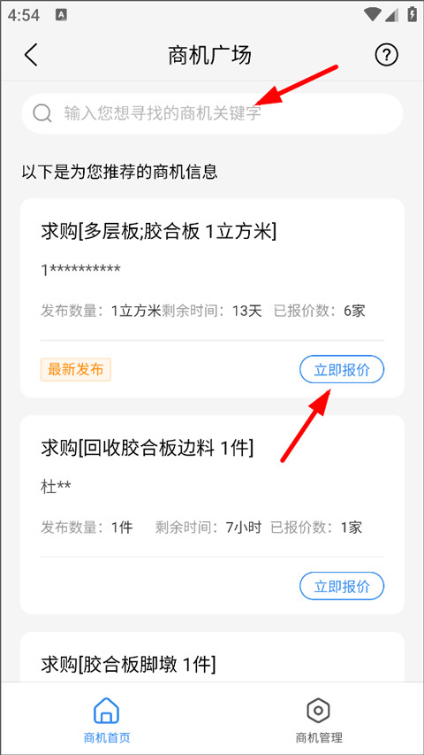 4、进入商机广场后,用户既可以通过搜索框输入感兴趣的商机关键词来查找信息,也可以浏览爱采购平台为您推荐的商机。对于爱采购的会员用户,每天在商机广场有三次报价的机会。